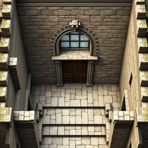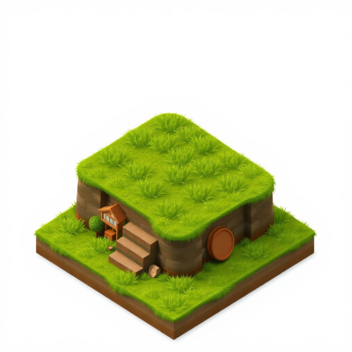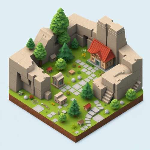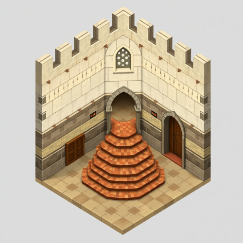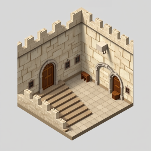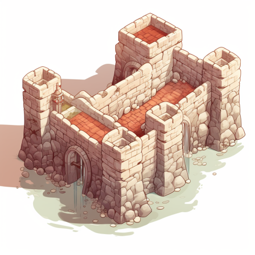 Isometric drawing of a straight medieval stone wall whit a moat around ir, in the art style of 90 anime, in the style of studio ghibli. Light warm soft colors. White background.