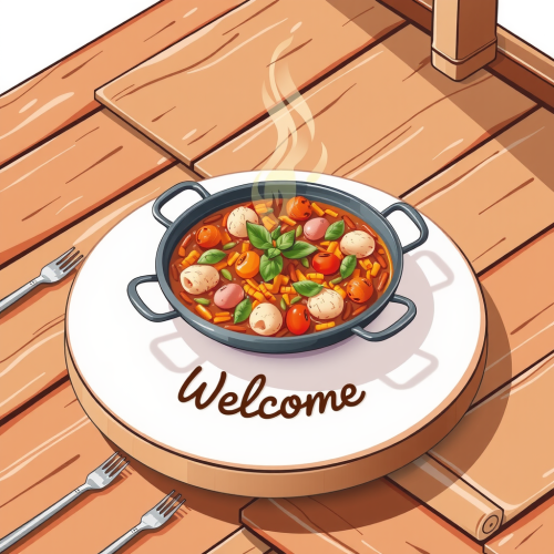 dibujo abstracto isometrico de una paella de pescado sobre fondo blanco --ar 4:5