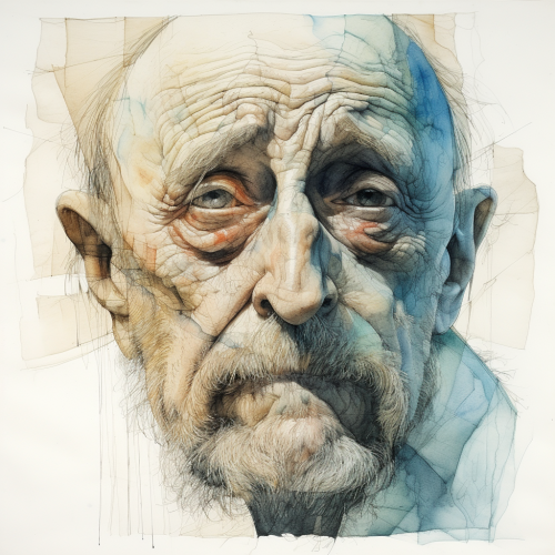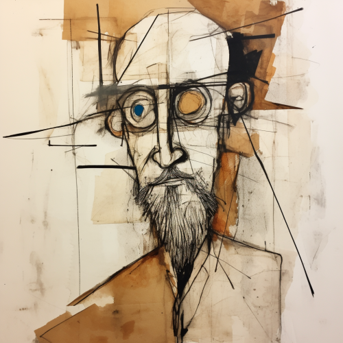 an abstract drawing of an old man pen and ink drawing, on stained parchment paper, muted splashed watercolors and lots of lines, rough, primitive