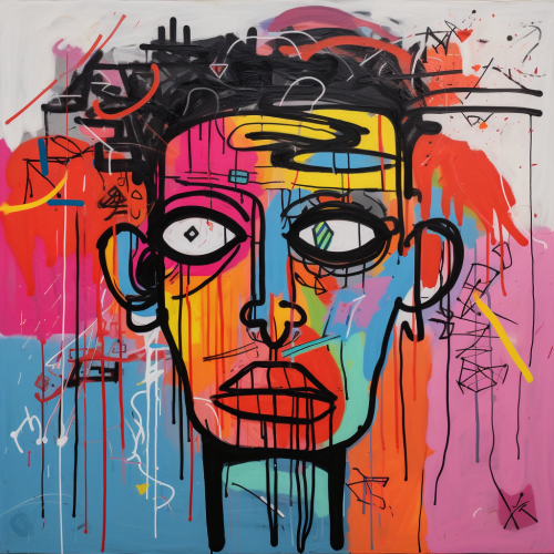 abstract paint, an empty dream, a man, simple line drawing, vibrant colors, basquiat style drawing