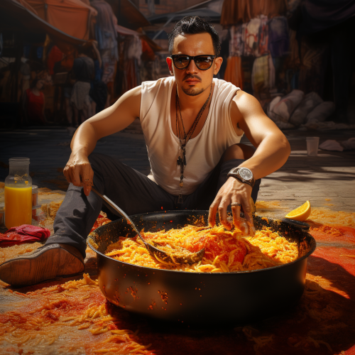 hyperrealistic style, Canon pro, a chinese Man having lunch in the Middle of a Bullring, he is eating paella Rice