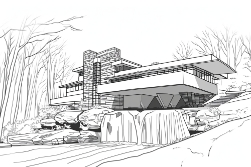abstract continuous one-line art drawing of Frank Lloyd Wright’s Fallingwater, black line white background, simple, minimalist --ar 3:2 --v 6.0