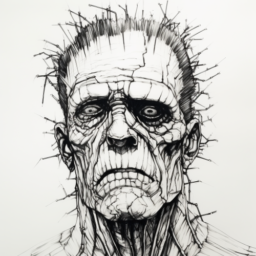 Continuous line drawing of the frankenstein monster, ultra minimalistic, fast sketch, fine point pen, abstract drawing