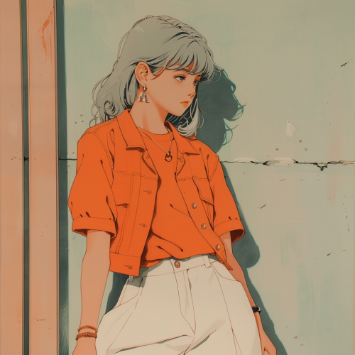 80s anime still, a girl with grey hair wearing an orange jacket and white skirt leaning against the wall a orange t-shirt and white skirt, in a retro fashion with muted pastel colors, in the style of Yoshiaki Kawajiri, Tsukasa Hojo, and Toshihiro Iino. --v 6.0