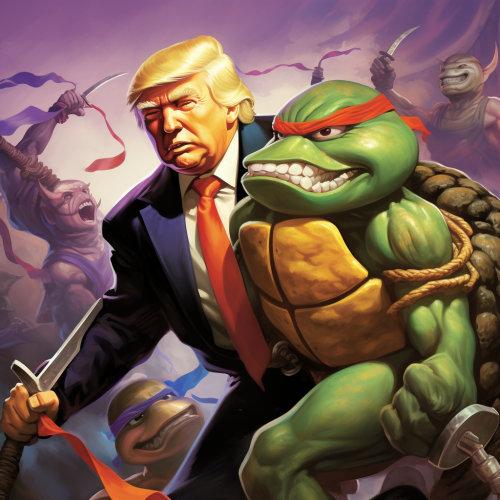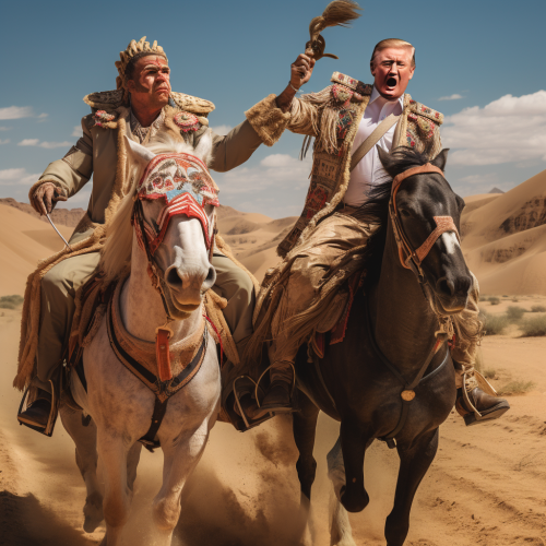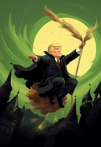 "Imagine Donald Trump riding on a majestic bald eagle flying high in the sky, carrying a figure in a suit, holding onto the eagle’s back with confidence. The eagle’s eyes glow with powerful lasers, cutting through the clouds, and the sky around them is a stunning mix of sunset colors. The scene is both epic and surreal, showcasing freedom and strength." This setup captures the drama and intensity, adding an imaginative twist while staying more open to interpretation!