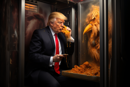 Donald Trump 3/4 portrait, eating the hottest chicken wing known to man, sweaty, gross, uncomfortable, sitting in a telephone booth --v 5.2 --ar 3:2