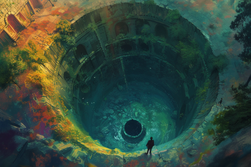 a person is standing nearby an ancient well, the well is surrounded by people shouting down into it, fantasy, colorful, --ar 3:2 --v 6.0