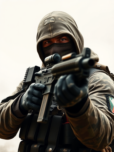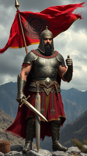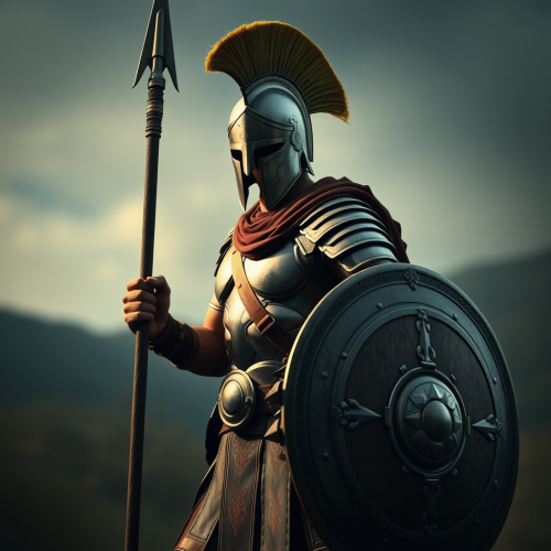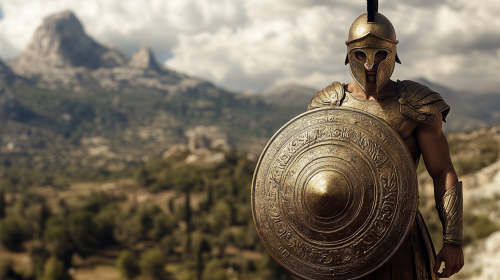 Ancient Greek hoplite soldier in full bronze armor, holding a large round shield with intricate designs, set against a backdrop of a mountainous battlefield, dramatic lighting, highly detailed. Hyper Realistic Hd photos --v 6.1 --ar 16:9