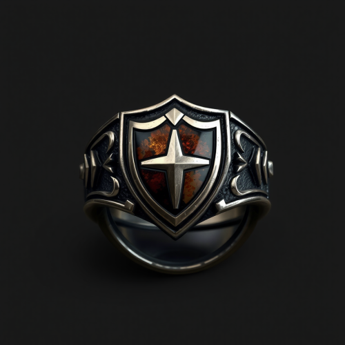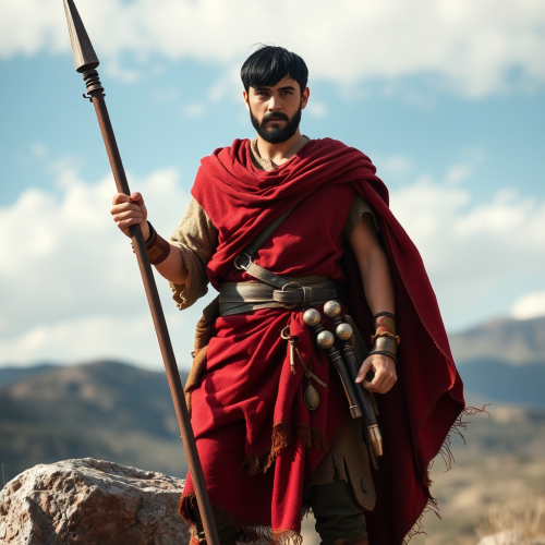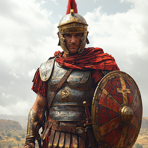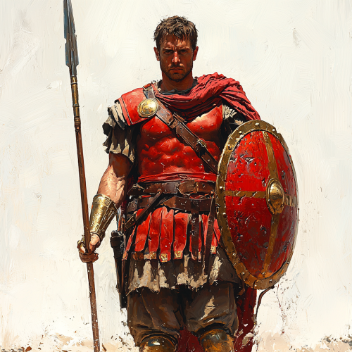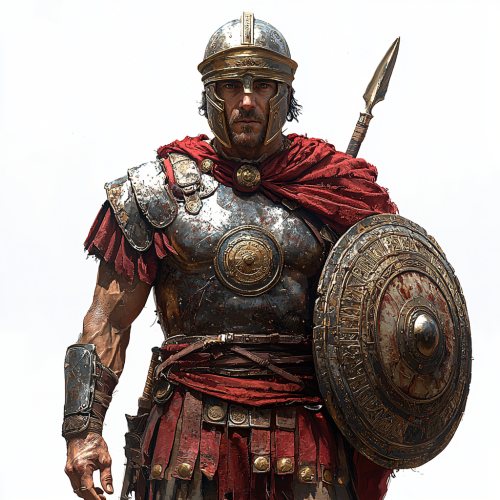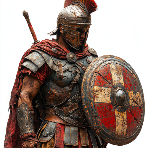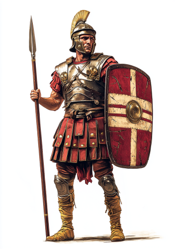 A Roman ancient soldier in armor, holding a shield in the left hand, and spear in right hand, full-body standing pose, white background, very photo realistic style, simple lines, no shadow, red color scheme, iron chestplate, red tunic, brown pants, yellow boots, two stripes of cloth tied around the waist. The man is wearing golden rings as jewelry. There's also a small Roman cross symbol drawn on his right shoulder. --s 1000 --q 2