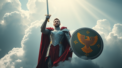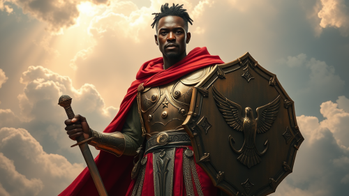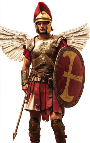 a very realistic photo of Roman soldier in armor, holding a shield and spear in the left hand, full-body standing pose, white background, realistic style, simple lines, no shadow, red color scheme, red chestplate, gold helmet with wings, red tunic, brown pants, yellow boots, two stripes of cloth tied around the waist. The man is wearing golden rings as jewelry. There's also a small Roman cross symbol drawn on his right shoulder. --ar 5:8