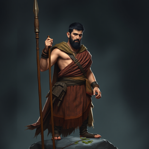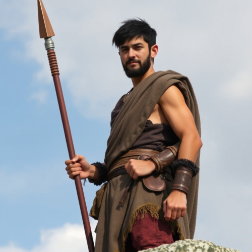 Greek warrior, Ancient Greece, light armor, light protective helmet, short tunic, pelta shield, short spear, background with Ancient Greek architecture.