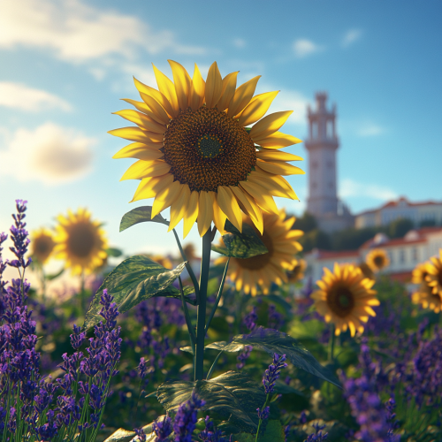 Hyper-realistic, cinematic-quality image of tall sunflowers under a vibrant clear blue sky during golden hour. The sunlight casts soft, realistic shadows, and the scene includes iconic Lisbon landmarks like the Belém Tower and Vasco da Gama Bridge, subtly blended into the natural environment. Native Portuguese flora, such as lavender and cistus flowers, surround the sunflowers with detailed textures and depth. The scene is focused on natural color grading and realistic lighting, with a shallow depth of field for a cinematic effect, indistinguishable from a photograph. No stylized, cartoonish, or painterly elements, only photorealism with rich, lifelike details - 16 by 9 aspect ratio –ar 16:9 –v 5 –q 2 –stylize 0 –quality 2 –hd