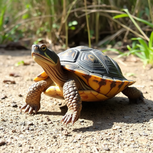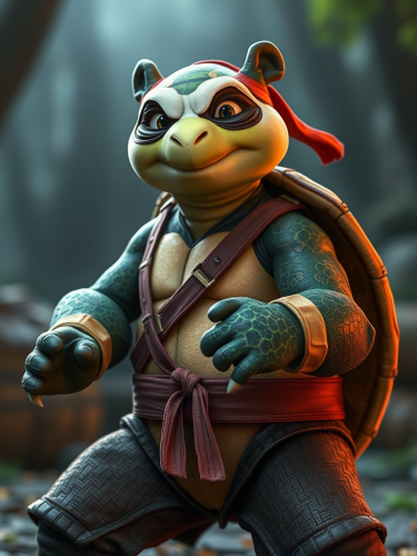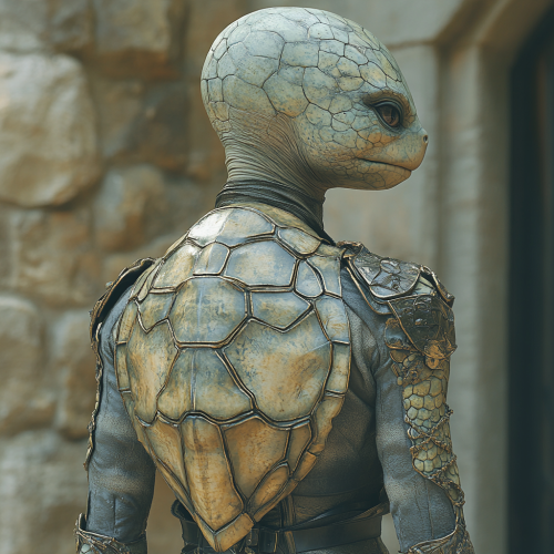 A photorealistic, back view of a bald-headed woman with a turtle shell on her back, depicted as a turtle monster girl with scales on her arms and legs, full body --s 750