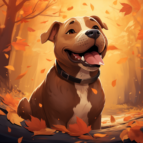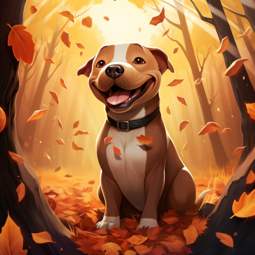 A disney-pixar inspired image. In the image is a staffordshire bullterrier. He has a light brown coat. His snout is dark and he has a big smile and you can see his whole body. The scene is autumn with falling leaves behind him. The scene should be in the distinct digital art style of Pixar, with a focus on character expressions and vibrant colors.