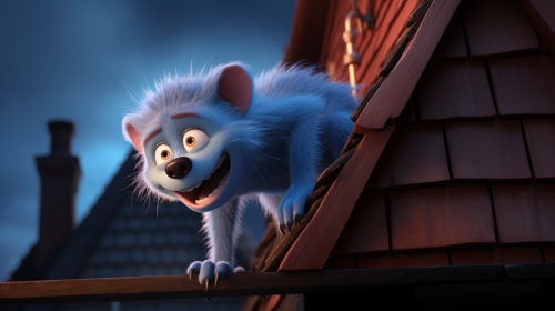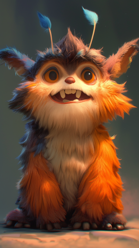 Create an image of an Ewok for animation. Small body 1984s style anthropomorphic cute alien, Ewok, Chinese dragon, cub, Ewok character mix. with large round ears and eyes, a white handlebar mustache, and bushy eyebrows. furry and cute. Buck teeth, Blue and orange alien patterned fur. in a 16:9 aspect ratio, art style DnD. 3D Pixar animated character, colorful. Happy, smiling. Cute Buck teeth minimal detail. --ar 9:16 --niji 6