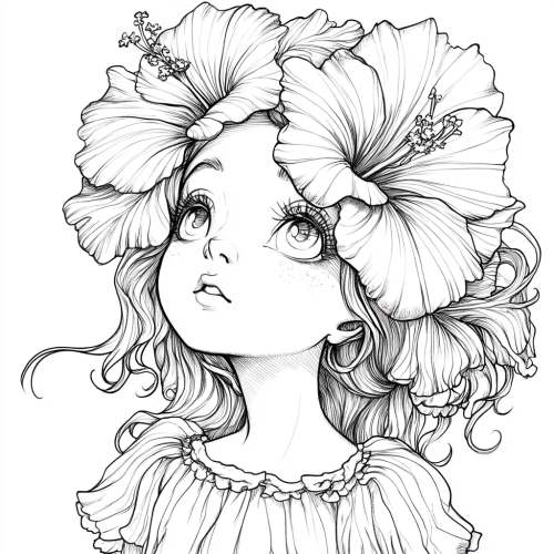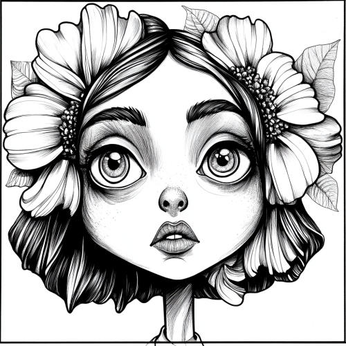 coloring page for kids,Pixar animation, Goddess character,Personification of a flower Zinnia, black thick line, low detail, Lines only with no shadow color, by Margaret Keane,Tim Burton, Mark Ryden