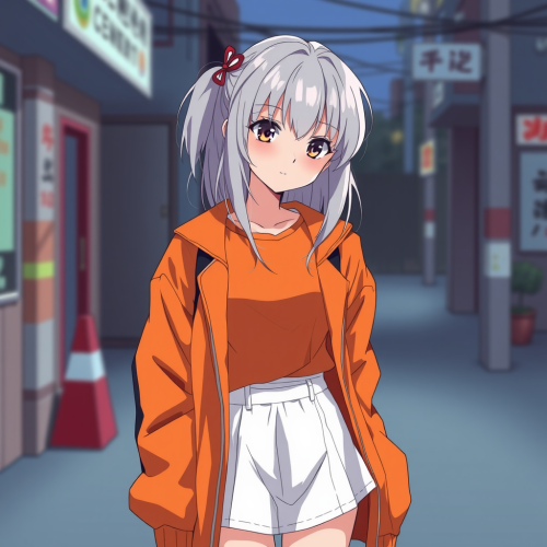 Jenna Ortega as a 1990’s retro anime character with dark brown bangs, she wears large circular glasses, a choker, a black top and long plaid orange skirt with black boots, retro 90’s style anime art, wide shot, full body character shot, drawing ar 9:16