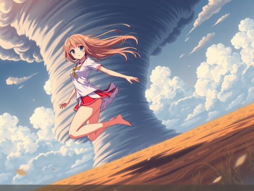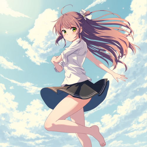 Anime girl hanging onto ground, skirt blown by wind.