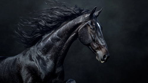 Black horse rises into the air to the right side, mane developing in the wind, on a dark black background with no extra effects, epic photo, hyperrealistic photo --ar 16:9 --quality 2 --v 6.1