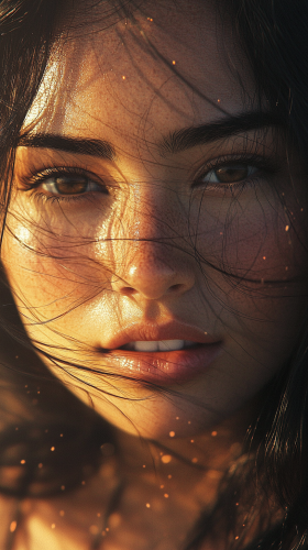 close up of a beautiful woman's face, illuminated by the morning sun. the sun is reflected in her eyes. her cheeks are rosy, and her skin is bronze. her black hair is blown by the wind. --ar 9:16