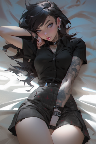 anime gothic female, black short skirt, on your bed, in the style of dynamic and exaggerated facial expressions, neon light colors, colab, blown-off-roof perspective, digital illustration in the style of 2D animation, phong shading, cinematic composition, hyperrealistic pop, cinematic lighting --s 1000 --c 9 --ar 2:3 --style expressive --upbeta --niji 5