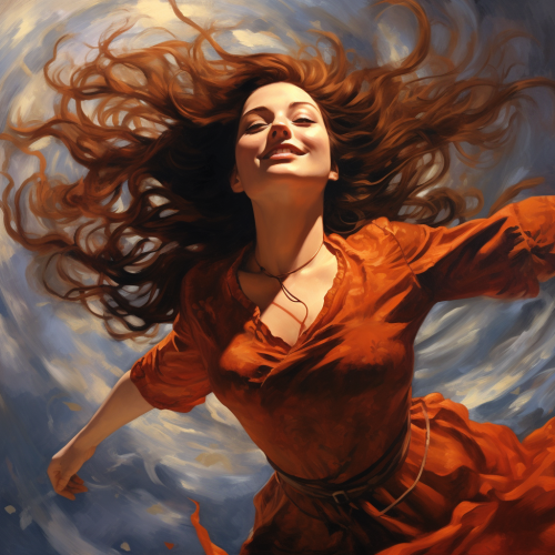 fantasy painting, a woman floats in the air, her hair floating in the wind