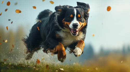 Strong wind blowing the fur of the tail of a red Merle Australian shepherd puppy. Autumn leaves are floating behind the puppy. Watercolor on white background, children’s book illustration, nursery wall art, on white background, 350 dpi, --v 6.0 --ar 17:9