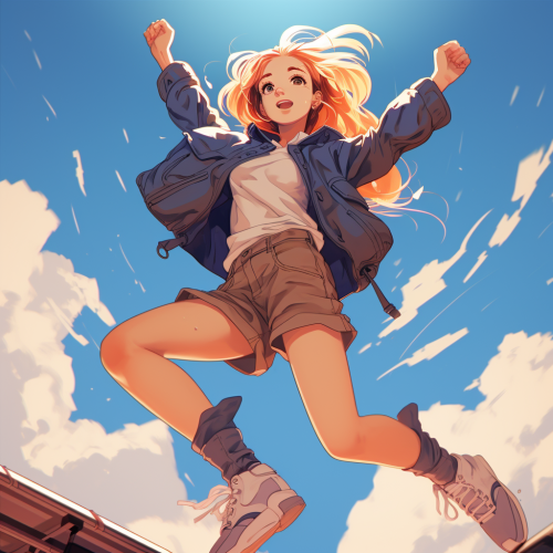 90s anime, dynamic pose, 20 year old female character, jumping down from above, attacking viewers, 90s anime digital drawing