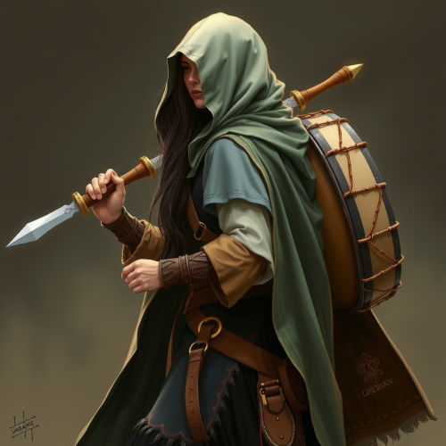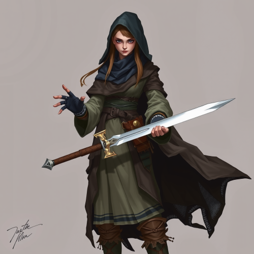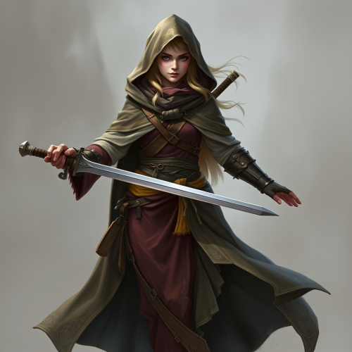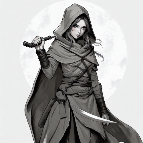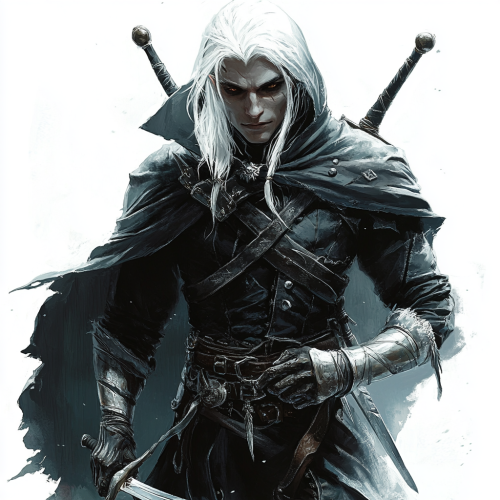 a winter eladrin elf with icey hair a small mustash and a black cloak with the hood up, he hold two daggers at the ready with skill and grace dnd art style