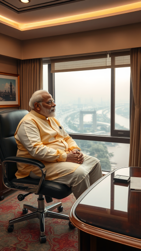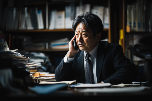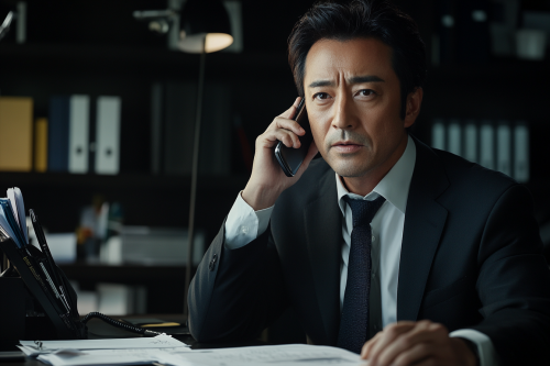 Photorealistic image of a Japanese male banker, age 40, speaking on the phone in a stylish and modern office, showing a focused and confident expression, surrounded by a clean desk setup with documents and a quality pen, exuding a polished, capable presence. Realistic photo, 8K resolution --ar 3:2 --v 6.1 --style raw