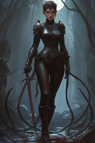 a full body shot of a shadow princess. She wears tight leather armor, a black tiara, and has daggers strapped to her thigh. Shadowy tendrils curve around her feet. In the background is a shadowy forest with subtle moon beams. Fantasy art detailed digital painting --ar 2:3 --v 6.1