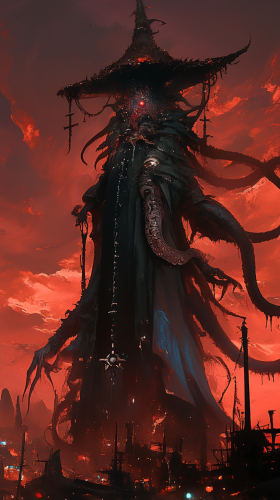 a tall creature wearing a giant hat with chains hanging down with a demonic squid face and is wearing a long gothic rob with tentacles coming out of the robe holding twisted daggers in a dark town + + horror + art style of Capullo, Brom, Whelan, aly fell rutkowski, art germ, rossdraws, and franzzeta + art station + ultra detailed + hyper realistic + 8k --ar 9:16 --niji 6