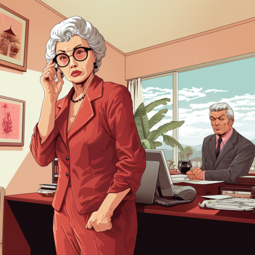 In the style of Grand theft auto promotional art. A japanese matriarch with grey hair in a red suit threatens a man angrilyin her luxury penthouse office. Cell shaded. Retro.