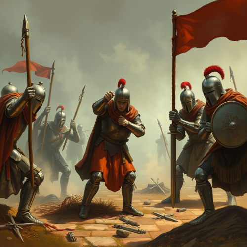 War in medieval times with two armies about to clash. The soldiers of the first army are on the left side of the battleground, they are wearing leather chest armor without helmet, they have no armor on their arms or legs, they are looking to the right side of the battleground. The soldiers of the second army are on the right side of the battleground, they are wearing full plate armor, they are looking to the left side of the battleground. On the top left there is a red sun shining the left half of the battleground. On the top right there are thunder clouds with an heavy rain which falls on the right half of the battleground. The armies are not in melee range. --ar 16:9
