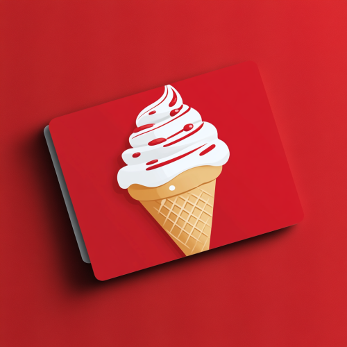 Design an original and creative business card for a red and white ice cream food truck. The card should have a fun, dynamic design with a vibrant red background and white accents. Incorporate a prominent visual of an ice cream cone with perfectly round gelato scoops in the center, aligned with the brand colors. Use a playful, bold font for the business name, and include the logo. The edges of the card could have a wavy or melting ice cream effect to make it unique and memorable. Add key details like contact info, website, and social media handles in a stylish yet clear format. The overall design should reflect the refreshing and delightful nature of the ice cream, with a modern and fun twist.