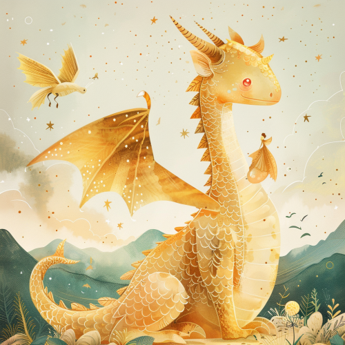 French-style children's illustration, featuring a full-body golden dragon with glowing wings and ruby eyes, with no text. High quality and high resolution, with soft colors. --v 6.0