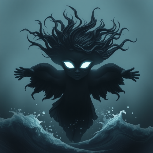close-up of a glowing black human man looking sullenly at the sky with empty black eyes, mouth agape, over a black background, fantasy art style. --ar 5:7