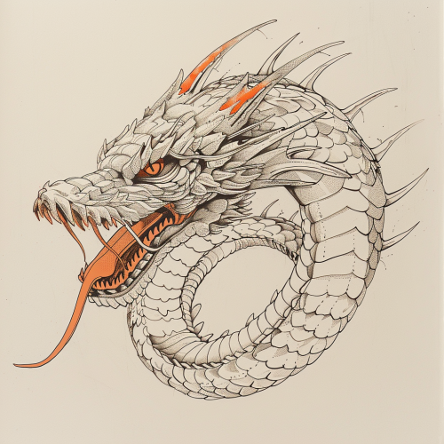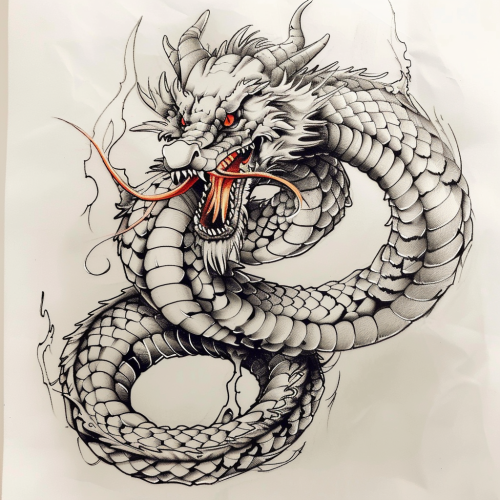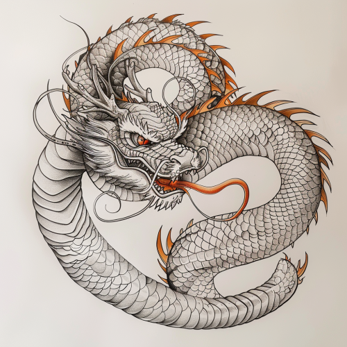 Draw fine black line image for tattoo of a coiled dragon colored in sepia. Add red eyes and orange tongue. Contrast sharply against solid white background. --v 6.0