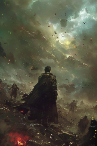 A calm bold man stands in a stormy battlefield, surrounded by chaos and aggression, with a serene expression and glowing eyes that show restraint and hidden power, as enemies shout around them --v 6.0 --ar 2:3