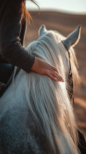 macro, female hands holding onto white horse mane on dark gray dabble horse while riding, sunlight, red desert, 8k detail, shot on a Sony Alpha a7 III camera --ar 9:16