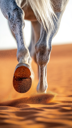 macro, horse hooves, dark gray dapple horse with white mane and tail running across sand dunes, red desert, sunlight, high contrast, 8k detail, shot on a Sony Alpha a7 III camera --ar 9:16