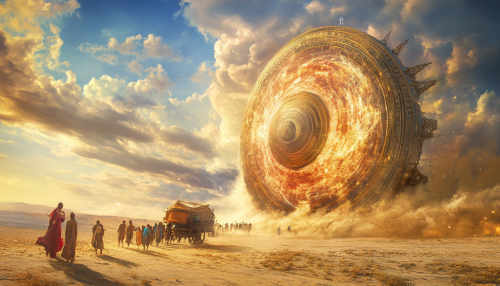 A majestic and inspiring realistic image of an enormous celestial flywheel of cosmic love and energy. A caravan of people are following the rolling flywheel across a desert. The gigantic flywheel leaves in its wake wave after wave of power which the people gratefully gather. A few disgruntled bystanders watch the procession, uncertain of what to make of it and missing out. The scene is evocative of the spiritual realities often hidden from us in other dimensions. --ar 7:4 --s 50