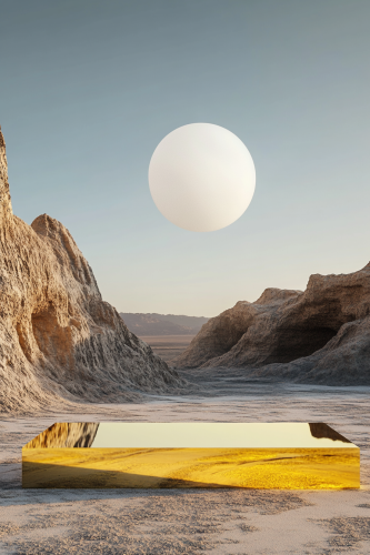 photo background, Minimal zen aesthetic wallpaper, A featuring desert and behide is a Abstract surreal cosmic scene background with low rocky mountains and sunset. sunset shining from above, sculpture and large white sun. In the foreground, there is an oval platform, The oval platform is yellow crystal. creating a surreal and ethereal atmosphere. Large panoramic view can see the Sky behind, the sky is cloudless. The overall look is sad and contrasting between the sky and the sand desert, in yellow gold and black tones. everything Material is transparent glass, Metallic mirror pillars, geometric mirror, deification, goddess , luxury theme, yellow ones, dark theme, a sense of luxury, 3D render, reality, Immerse yourself in a world of creativity, --ar 2:3