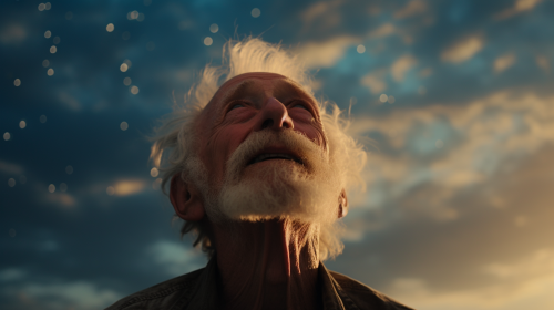 cinematic still, film by Christopher Nolan, of the sky opening up, magestic, Close up of 95 year old apostle john looking up at the sky in a beach, while the sky opens up, magestic close up, 35mm --v 5.2 --ar 16:9
