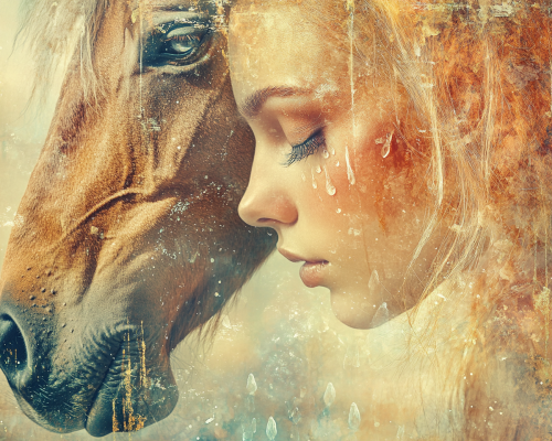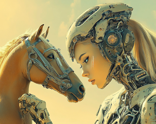 a beautiful robotic woman daydreaming with open eyes, she is staring into the horizon, her beautiful brown horse is waiting patiently by her side bending down as if grazing , the woman has a light makeup, emotional art, bright colors, negative colors, shapes are fluid and undefined, high definition digital art, negative color, a mix of pastel colors and neon, a poetic and creative perspective, inspired by Man Ray's visionary photography, large-screen camera, photo art that is also inspired by digital art, cold color scale with hints of flickering neon, --ar 5:4 --p 6s1y8tz