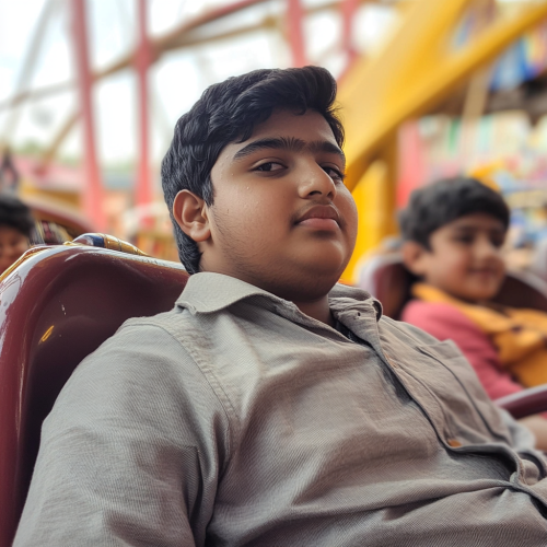 16 year old fat Indian school boy sitting in roller coaster ride. The seat besides him is empty. the remaining roller coaster is filled with kids. Everyone is enjoying