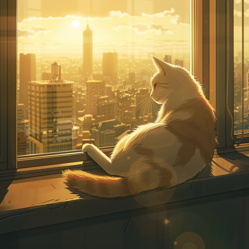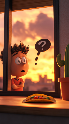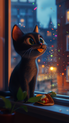a 3D animated tabby cat teleporting back onto a windowsill, trail of confetti and sparkles, half-eaten taco in mouth, mischievous expression, city evening scene visible through window --ar 9:16