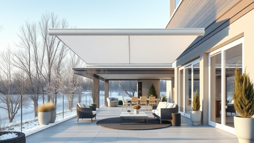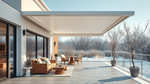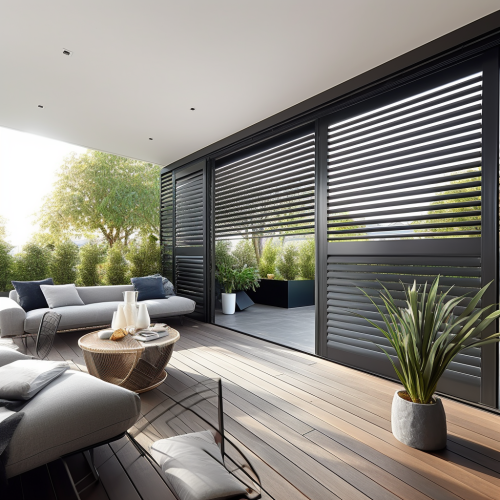 Create an image that showcases the exquisite craftsmanship of Meaux's finest blinds and roller shutters. Focus on the intricate details of their sleek, modern designs and the flawless integration with the surrounding architecture.
