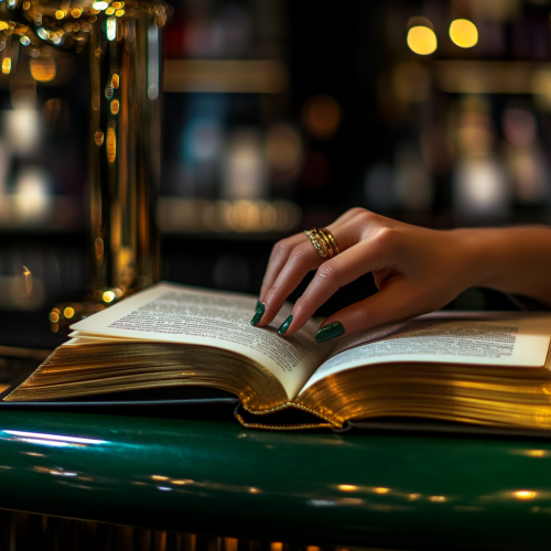 a photo of an open book sitting on a modern style bar with a stylish hand with gold rings and manicured nails coming out, bright and cheerful, colorful, green, black