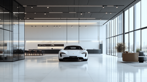 a sleek, ultra-modern interior of a luxury car dealership. The space should have minimalist architecture with sharp, clean lines, glass walls, polished concrete or marble floors, and bright, even lighting. Large windows bring in natural light, and subtle, elegant decor is placed strategically. Leave ample central space for a car to be displayed, ensuring the layout feels open and uncluttered. The overall vibe should be futuristic and sophisticated, similar to an Apple Store, with high-end materials and a professional yet welcoming atmosphere. --ar 16:9 --v 6.1